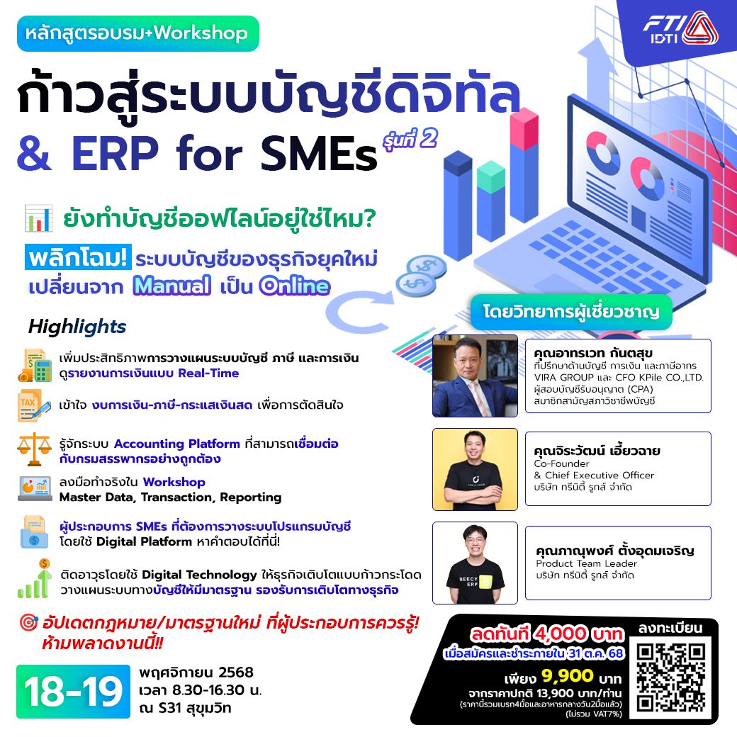 📣 เปิดรับสมัครแล้ว! หลักสูตรอบรม + Workshop “ก้าวสู่ระบบบัญชีดิจิทัล & ERP for SMEs รุ่นที่ 2” ยกระดับธุรกิจด้วยเทคโนโลยีบัญชีดิจิทัล พร้อมรับมือกฎหมายและมาตรฐานใหม่!