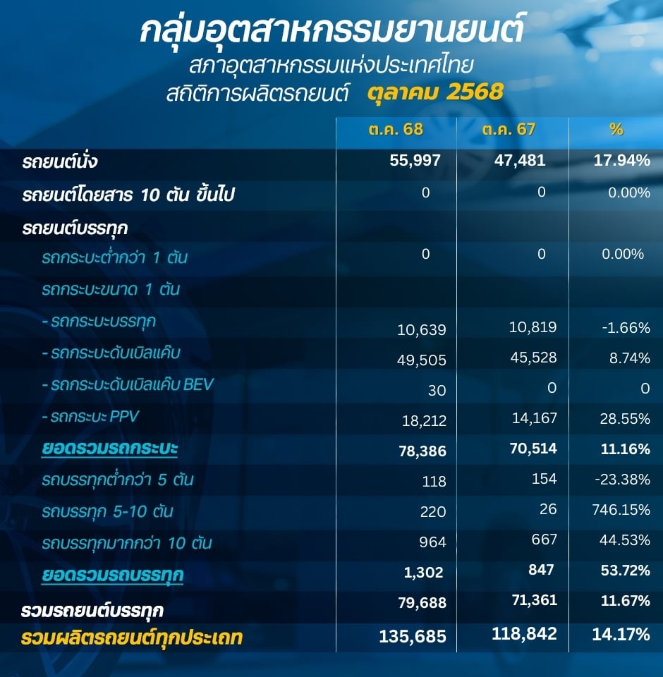 ยอดผลิตรถยนต์ไทย ต.ค. 2568 อยู่ที่ 135,685 คัน โต 14.17% รถยนต์นั่ง–กระบะ 1 ตัน ขยายตัวเด่น